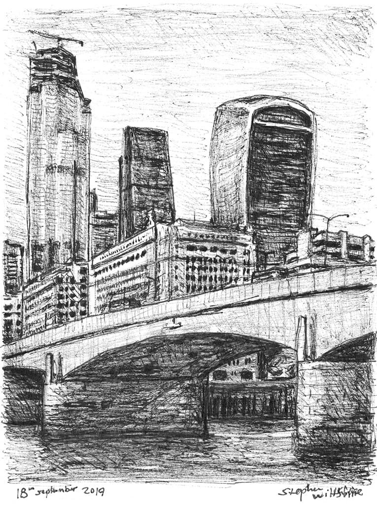 Original Drawing of 22 Bishopsgate and Walkie Talkie at London Bridge measuring 148 x 210 mm, created and hand drawn by the artist.