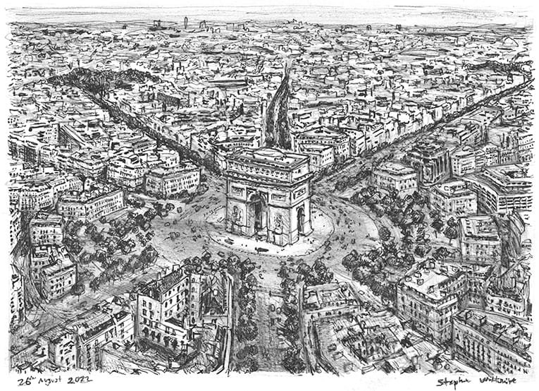 Original Drawing of Aerial view of Arc de Triomphe measuring 210x 148mm, created and hand drawn by the artist.