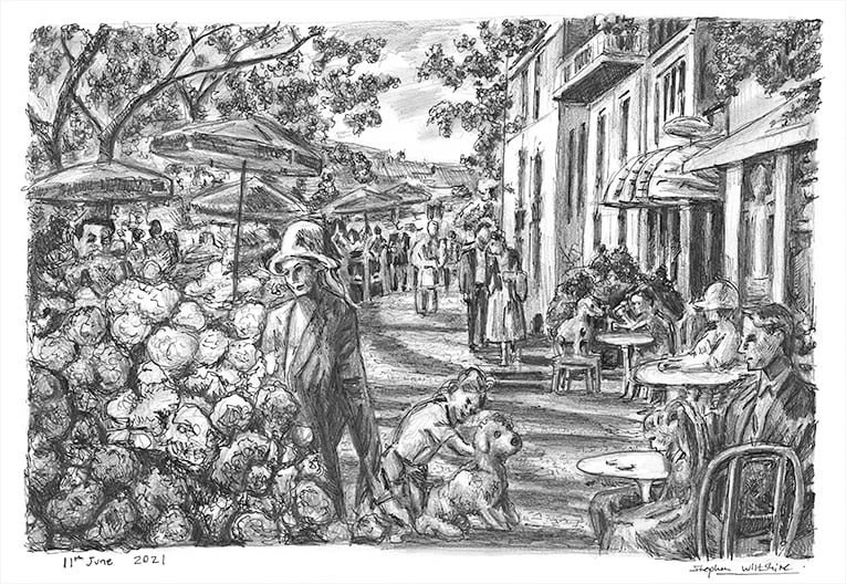 The drawing captures a lively street scene with its outdoor dining atmosphere. While patrons enjoy their time at café tables, the view extends into a street bustling with pedestrians adding to the vibrancy of urban life.