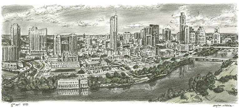 Original Drawing of Austin, Texas measuring 420 x 210mm, created and hand drawn by the artist.