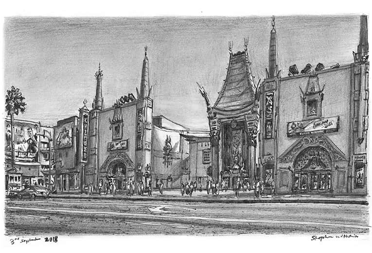 Original Drawing of Chinese Theatre, Los Angeles, California measuring 297 x 210mm (A4), created and hand drawn by the artist.