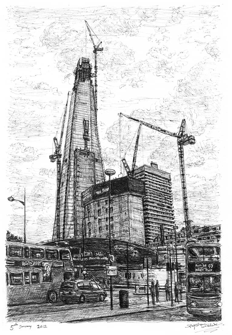 Original Drawing of Construction of Shard of Glass London measuring 210 x 297mm (A4), created and hand drawn by the artist.