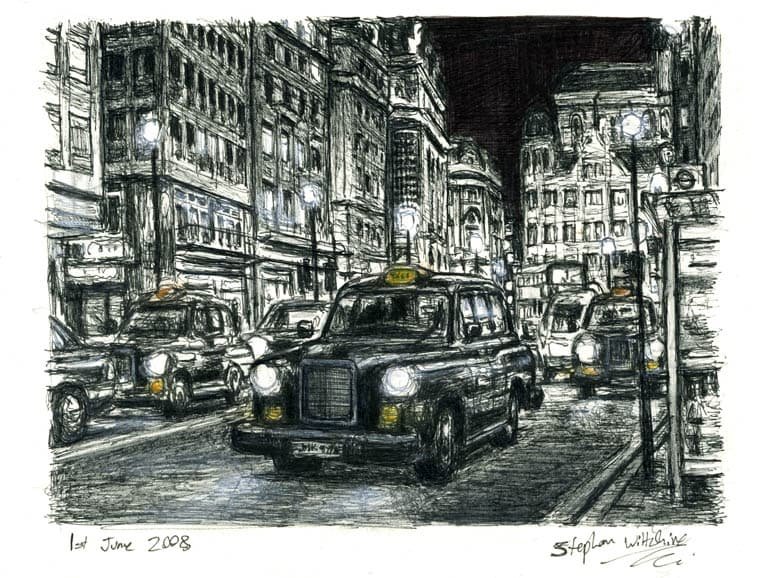 Drawing of London Taxi Cab at Haymarket at night