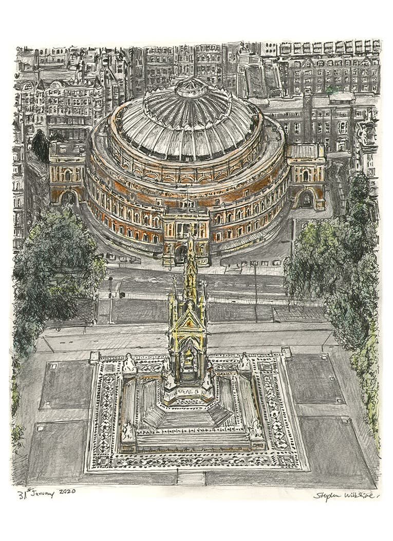 Buy the Framed Artwork of the Original Aerial view of Royal Albert Hall Drawing – Framed Original Art – Drawings of Cities and Street scenes