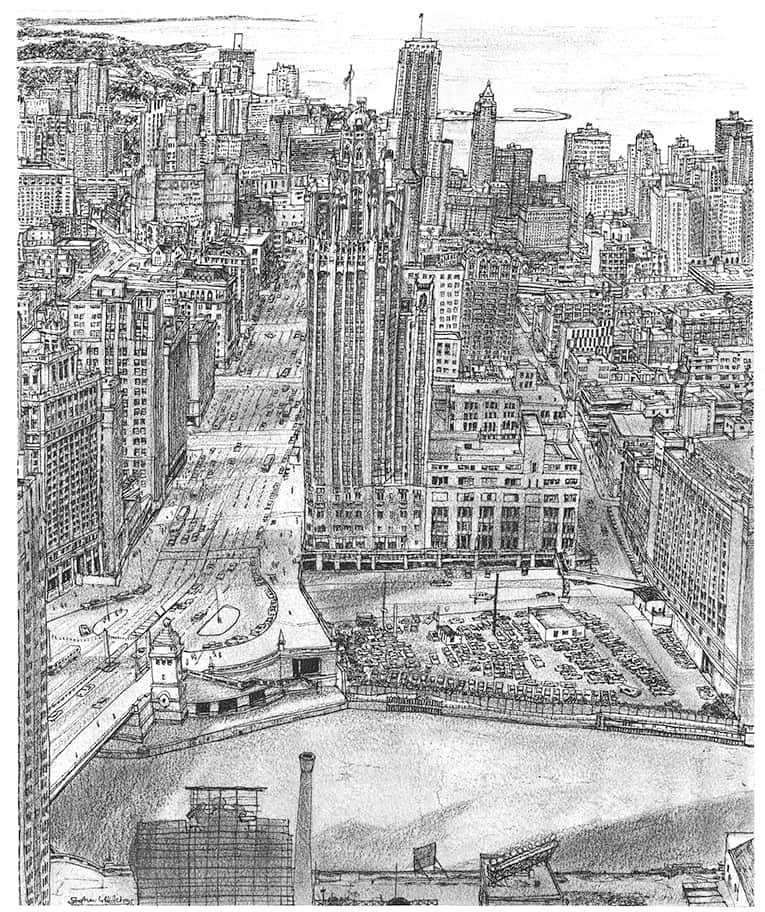 Lake Michigan shoreline can be seen in the distance and the foreground is dominated by the Chicago river and the Tribune Tower. Several days were required to execute this drawing. Faultless perspective, as ever, and a real sense of the feel of the city is caught in this masterly drawing.
