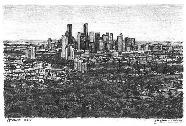 Open Edition Prints of the Original Drawing Aerial view of Downtown Houston Skyline measuring 210 x 148mm (A5), created and hand drawn by the artist.