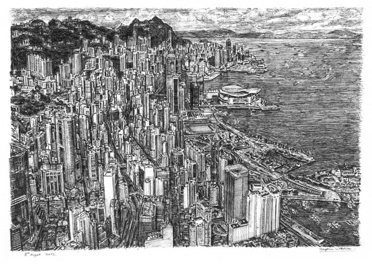 Open Edition Prints of the Original Drawing Aerial view of Hong Kong measuring 420 x 297mm (A3), created and hand drawn by the artist.