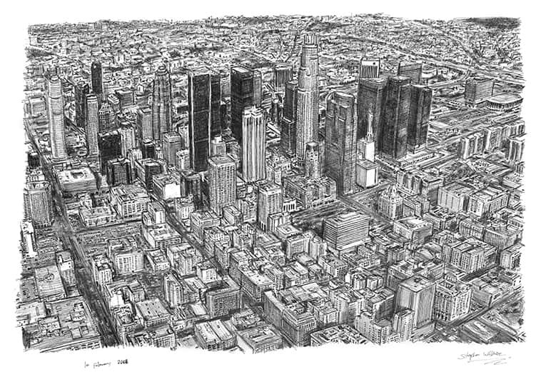Open Edition Prints of the Original Drawing Aerial view of Los Angeles Skyline measuring 594 x 420mm (A2), created and hand drawn by the artist.