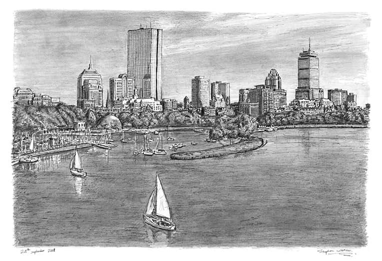 Open Edition Prints of the Original Drawing Boston Skyline measuring 420 x 297mm (A3), created and hand drawn by the artist.