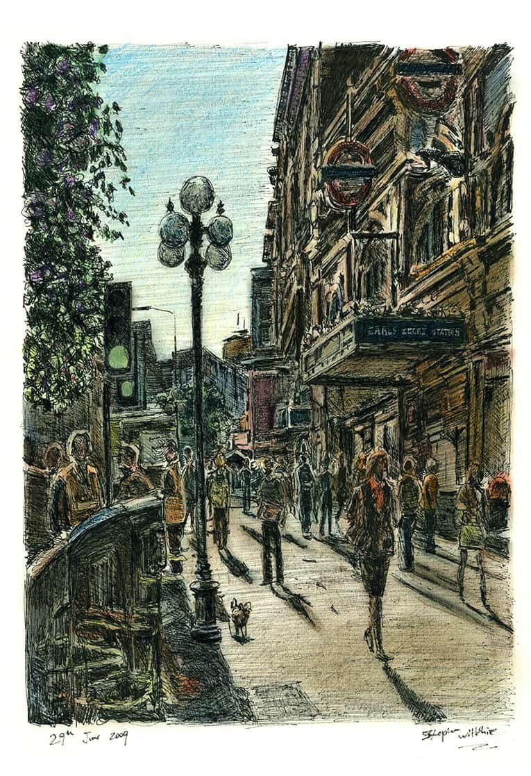 Earls Court Station is one of Stephen’s most vivid creations to date. You may notice that everyone on the drawing is in perfect shape including the four legged friend patiently awaiting while tied to the lamp post.