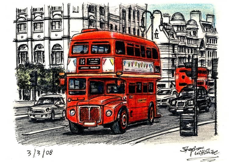 Open Edition Prints of the Original Drawing London Routemaster Bus at the Strand measuring 210 x 148mm (A5), created and hand drawn by the artist.