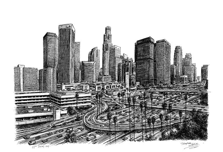 Open Edition Prints of the Original Drawing Los Angeles Skyline 2007 measuring 594 x 420mm (A2), created and hand drawn by the artist.