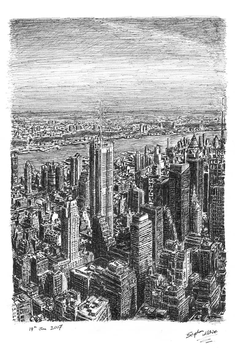 Open Edition Prints of the Original Drawing Manhattan Skyline from top of Empire State measuring 420 x 594mm (A2), created and hand drawn by the artist.