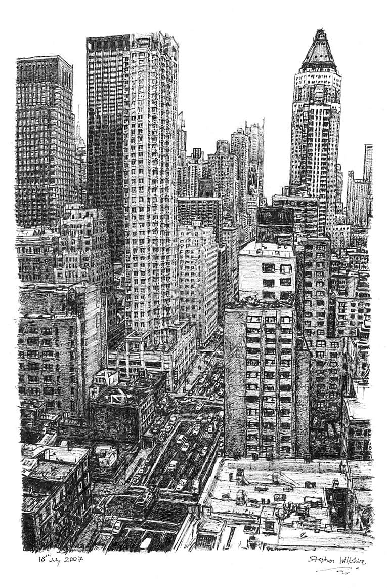 Open Edition Prints of the Original Drawing New York street scene measuring 420 x 594mm (A2), created and hand drawn by the artist.