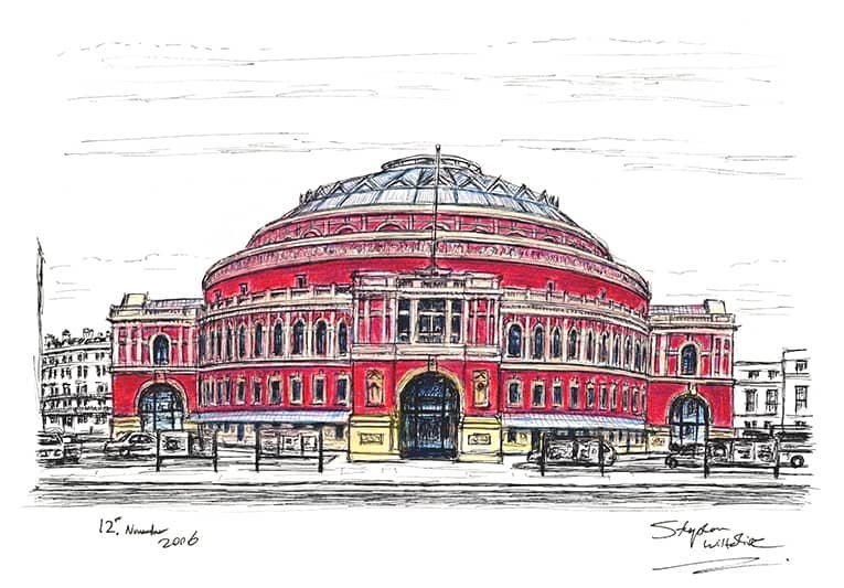 Open Edition Prints of the Original Drawing Royal Albert Hall in colour measuring 420mm x 297mm (A3), created and hand drawn by the artist.