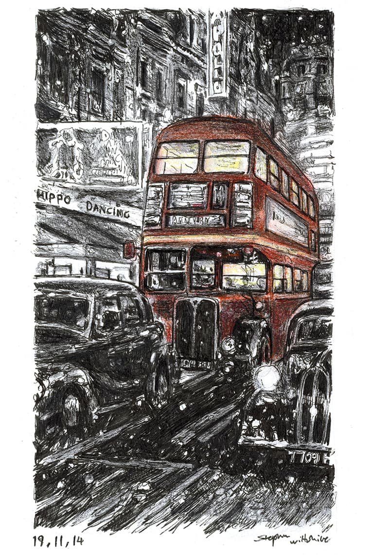 Open Edition Prints of the Original Drawing RT London bus on a winters night measuring 148 x 210mm (A5), created and hand drawn by the artist.
