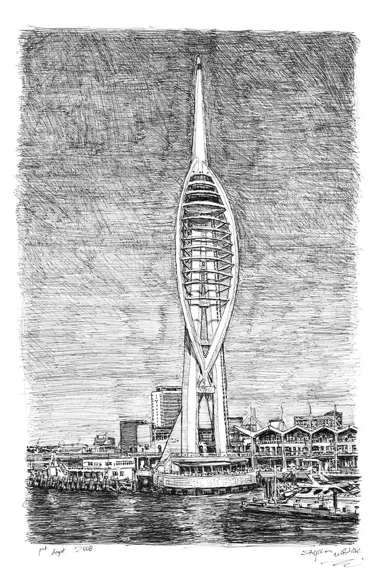 Open Edition Prints of the Original Drawing Spinnaker Tower, Portsmouth measuring 297 x 420mm (A3), created and hand drawn by the artist.