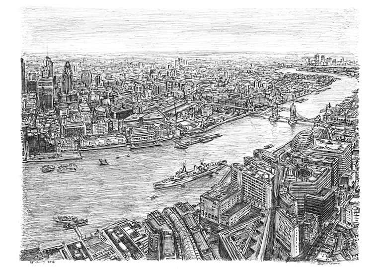 Stephen is the first artist to be invited to The View from The Shard to capture the ever developing London skyline from the vantage point of Western Europe’s tallest building, at 244m/800ft above ground. His drawing, looking north-east over the capital, features the iconic landmarks of the City, HMS Belfast, Tower Bridge, and Canary Wharf, in spectacular detail.