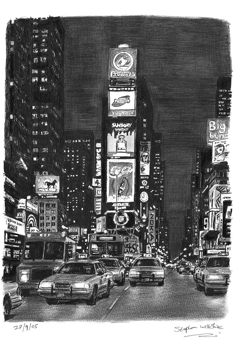 Open Edition Prints of the Original Drawing Times Square at night measuring 420 x 594mm (A2), created and hand drawn by the artist.