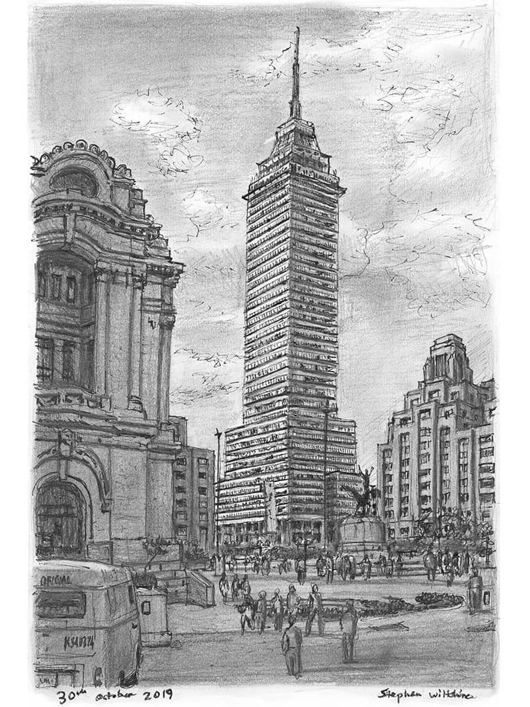 Open Edition Prints of the Original Drawing Torre Latinoamericana, Mexico City measuring 210 x 297mm (A4), created and hand drawn by the artist.