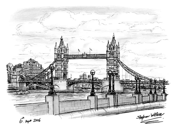 Open Edition Prints of the Original Drawing Tower Bridge 2006 measuring 420 x 297mm (A3), created and hand drawn by the artist.