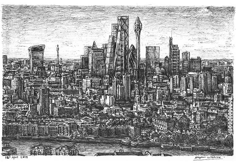 Open Edition Prints of the Original Drawing Tulip Tower, City of London measuring 297 x 210mm (A4), created and hand drawn by the artist.