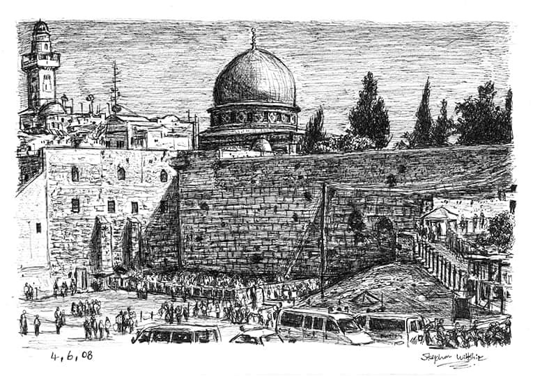 Open Edition Prints of the Original Drawing Wailing Wall Jerusalem measuring 291 x 210mm, created and hand drawn by the artist.