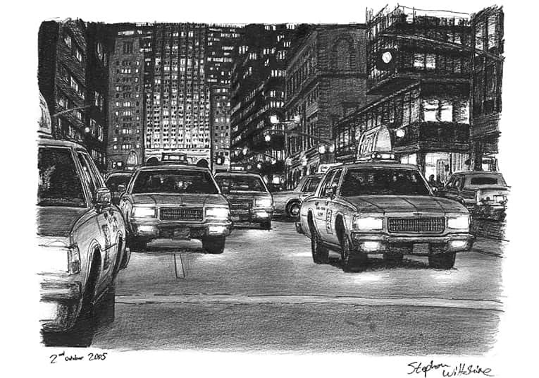 Open Edition Prints of the Original Drawing Some yellow New York taxis at Park Avenue at night measuring 420 x 594mm (A2), created and hand drawn by the artist.